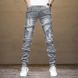 2023 Summer New Men's Light Gray Slim Fit Motorcycle Patchwork Frayed Hem Jeans Trendy Skinny Mid-Waist Pants