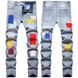 Cross-Border Foreign Trade Men's Slim Fit Fashion Small Foot Embroidered Jeans Colorful Patch Elastic Washed Blue Long