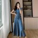 Denim Dress, Medium Length Ruffled Edge A-Line Skirt, Casual Korean Version, Flying Sleeve, Round Neck, Short Sleeved