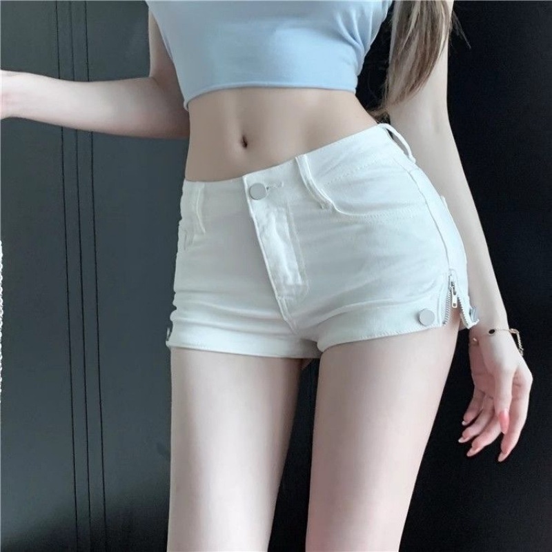 Side Zipper White Denim Shorts for Women, Summer High Waist Slimming Hot Girl Ultra Shorts, Tight Hot Pants, Wide Leg Pants