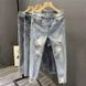 Ins Korean version men's ripped hole slim fit nine inch jeans summer youth fashion light blue rotten pants legs tight fitting small leg pants