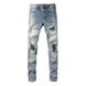 Men Leather Patches Denim Jeans Streetwear Holes Ripped High Stretch Pants Light Blue Skinny Tapered Trousers
