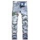 Men Snake Embroidery Jeans Streetwear Pleated Patch Slim Tapered Pants Ripped Distressed Stretch Denim Trousers