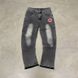 Men's US Map AA Distressed Denim Jeans - Straight Cut Fringe Hem Pants With 3D Embroidered Coordinates