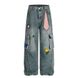 Unique Design Patch Embroidery Cargo Jeans Men's Punk Vintage Washed Loose Straight Long Pants