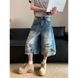Vintage Camo Patchwork Denim Shorts – Distressed Americana Cutoffs (Unisex Relaxed Fit, 55% Polyester, Raw Hem Detail, Streetwear Essential)