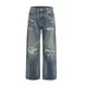 Vintage Washed Blue Distressed Patchwork Denim Jeans With Silver Selvedge & Whiskering - Straight Leg Relaxed Fit For Men & Women