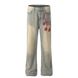 Washed Vintage Mud Yellow Jeans American High Street Style Personalized Embroidery Chain Casual Straight Long Pants For