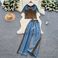 Women's Clothing Fashion Suit Summer Retro Short Sleeved Splicing Casual Tops High Waist Denim Wide Leg Pants Two Piece Suit