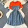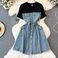 Women's Clothing Fashion Two Piece Short Sleeved Round Neck Patchwork Waist Slimming Medium Length A Line Denim Dress