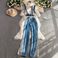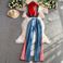 Women's Clothing Half Turtleneck Sleeveless Design Denim Patchwork Striped Short Hot Girl Top + High Waist Slim Wide Leg Pants Two Piece Set
