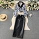 Women's Clothing Hong Kong style chic suit collar floral chiffon shirt high waist tight PU leather skirt female high end outfit two piece suit
