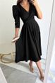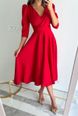 Women's Clothing solid color V neck waist bubble three quarter sleeves swing dress long
