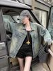 American Heavy Industry Rhinestone Embellished Denim Jacket for Women, Mid-Length, Early Spring and Autumn, Petite Rivet Distressed Workwear Jacket Top