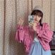 Korean Chic Oversized Denim Jacket – Cropped, Puff Sleeve, Multi-Pocket, Lapel Collar (One Size, Dark/Light Blue/Pink, 90s Retro Streetwear)