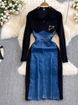 Women's Clothing Temperament Long Sleeve V Neck Waist Slim Denim Patchwork Medium And Long Hip Dress